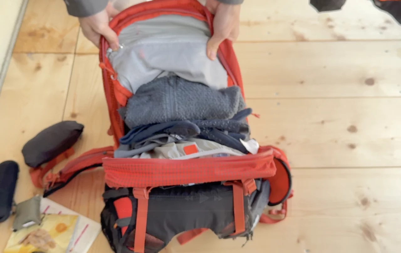 メインコンパートメントの最上部にはアルファダイレクト90ULジャケットとウィンドブレーカーを収納します。これらは体温調整のためにザックから盛んに出し入れする可能性が高いことを想定しています。また登山開始に装着するキャップ、グローブ、サンシェードも収納しておきます
