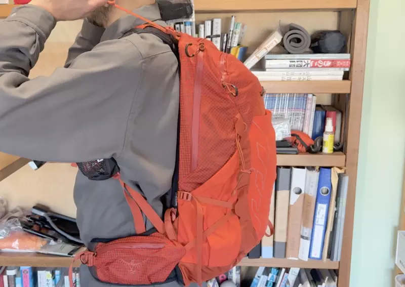 オスプレーのタロンプロ20はメインコンパートメント以外に、ジップ付きポケットがザック上部に備わり、ストレッチ素材のフロントポケット、ストレッチ素材のサイドポケット、左右にウエストベルトポケットが付いていて、よく使う装備を様々な位置に収納することができます。