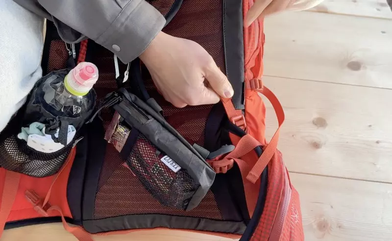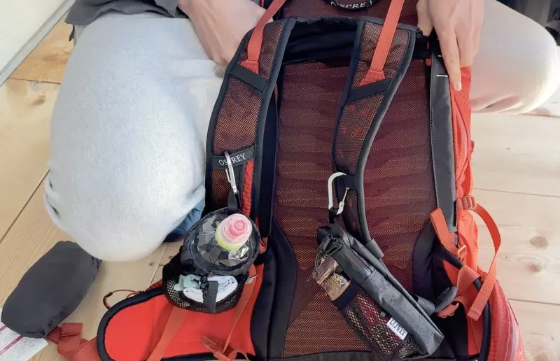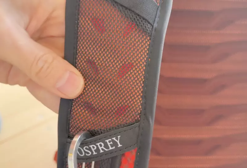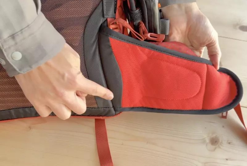 体側にはハイドレーションを収納することができるポケットとクリップが備わっています。そして反対側にはジッパー付きのメッシュポケットがあるので登山中に使用することが少ない貴重品を収納しておくのに便利です。