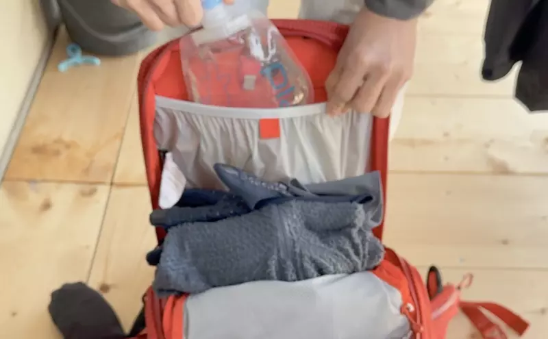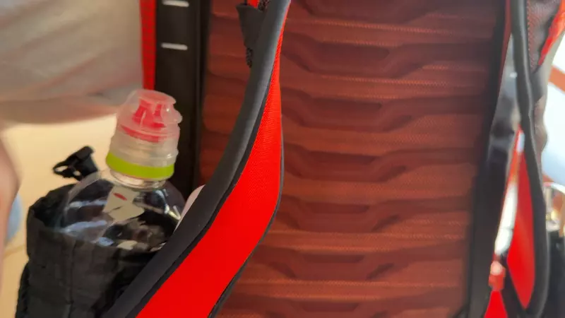 このサイドポケットはフロントポケットの素材と同様のストレッチ素材で中に入れたものをしっかりと固定します。ザックに荷物をパンパンに詰め込んだ状態で1Lのナルゲンボトルを入れようとしましたが、結構きついのでおすすめしません。ペットボトルであれば問題なく収納することができますが、ボトルを入れる時に、ポケットの外側にあるストラップと干渉するので、この部分にボトルを入れるのはいまいちだと感じます。