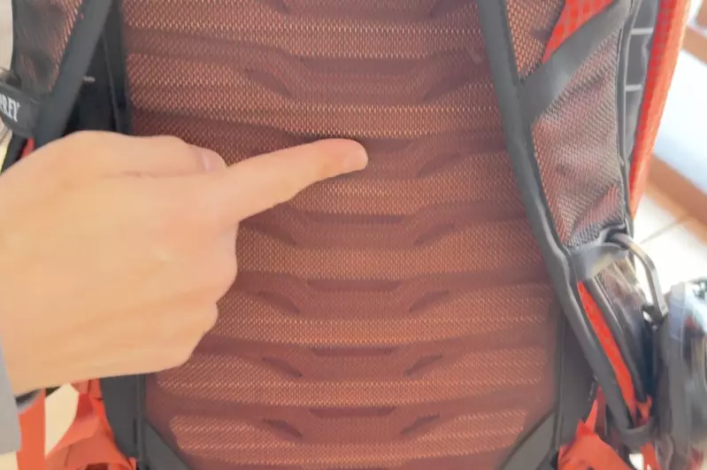 背面パッドは「インジェクション成形」と呼ばれる、溶かしたプラスチックを金型に射出・冷却することで成形品を作る方法で作られており、複雑な構造で背中の蒸れを放出してくれます。体に当たる部分のパッドは背中と腰でデザインが異なっており、どちらも凹凸によって熱がたまらないようにデザインされています。