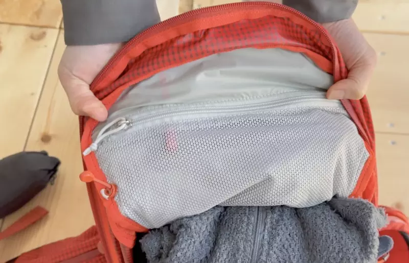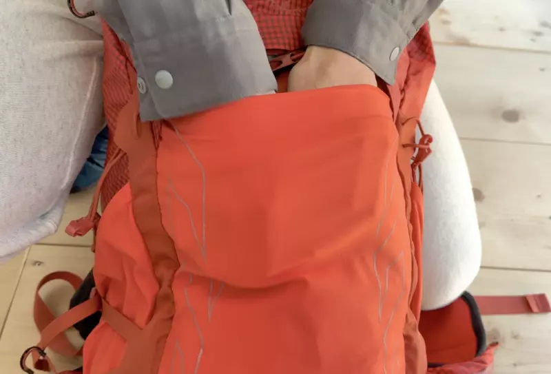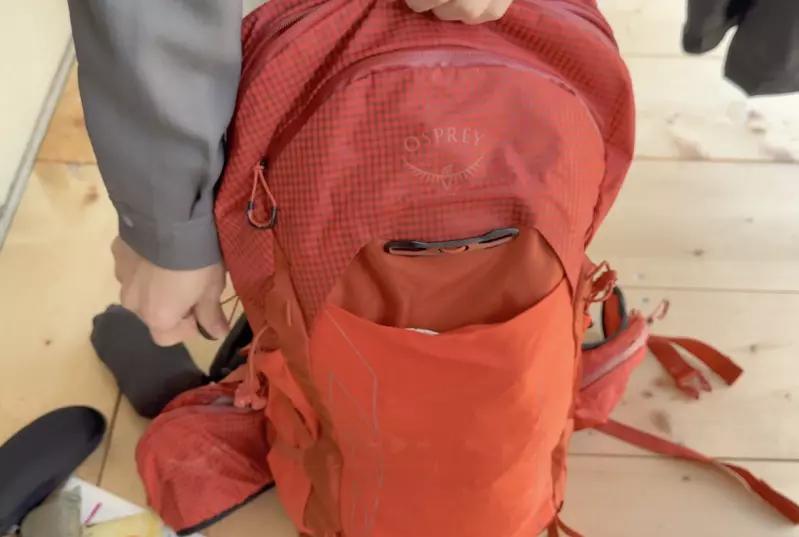 フロントポケットは降水確率が高い時にレインウェアであったり、風が強い時にはウィンドブレーカーを収納します。このポケットはストレッチ素材なのでウェアをを入れた時にしっかりとコンプレッションをしてくれるので登山中に落下させることを防いでくれます。
