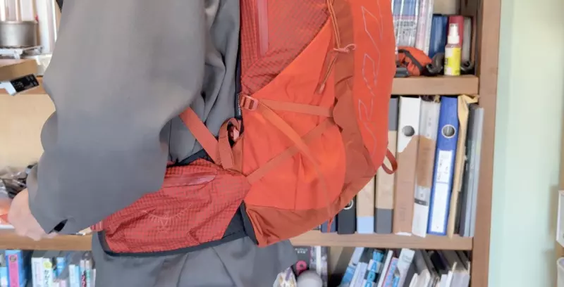 続いて背面パネルとショルダーハーネス、またウエストベルトの連結部分については、シームレスに一体化されていると体への密着感が素晴らしく、背負っていてザックと体が一体化されているようなフィット感を生み出してくれます。