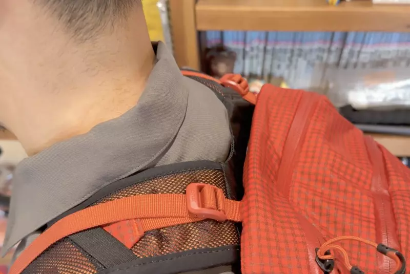 タロンプロ20は背面パネルから伸びるようにショルダーハーネスが取り付けられており、背中から肩にかけて立体的にフィットするようにデザインされています。だから背負っていて空間が生まれにくく、これによって肩周りのフィット感は格段に良くなっています。