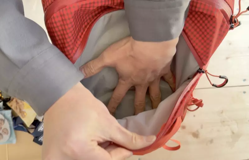 を収納しています。このポケットはU時型で、縦60%ぐらいまで開くので、中のものを取り出しやすく非常に便利です。止水のダブルジッパーで右からも左からも開け閉めができるのも便利です。