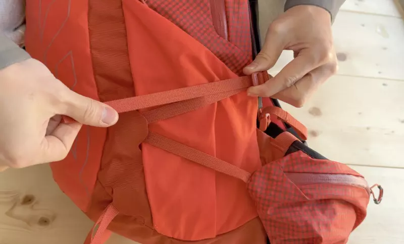 ザック本体とウエストベルトを連結するストラップが秀逸で、ザック下部のコンプレッションとザックと体を近づけるための機能を両立しており、このストラップ1つを閉めるだけで、ザックの中に入っている荷物に対してのベストなウエストベルト位置を調整することができます。