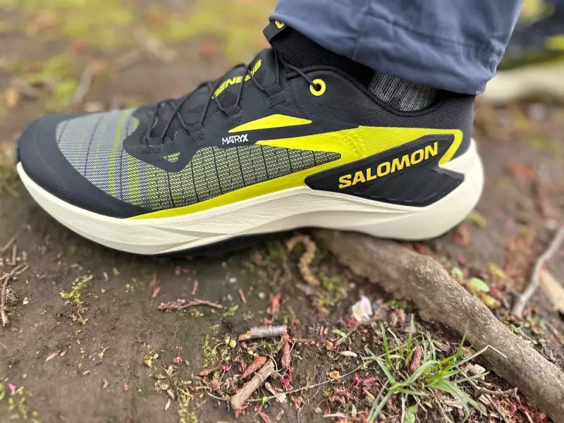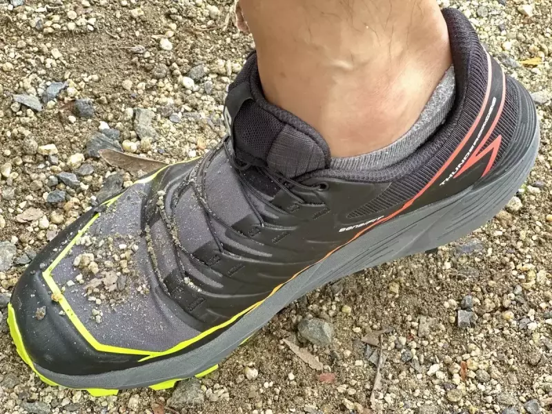 アウトソールは柔らかい土の上でも優れたグリップ力を発揮するVibramメガグリップを搭載し、起伏の激しい路面での力強い走りが可能です。防水機能を備えたため、天候を気にすることなくランを楽しめます。