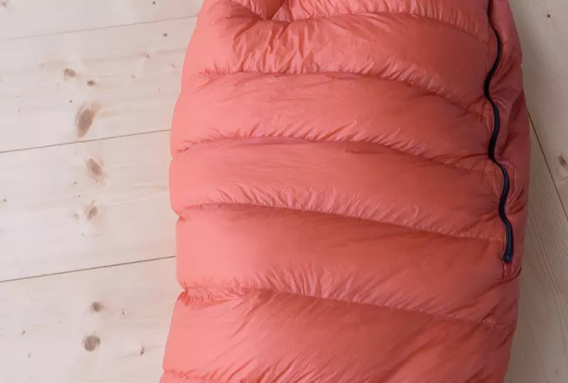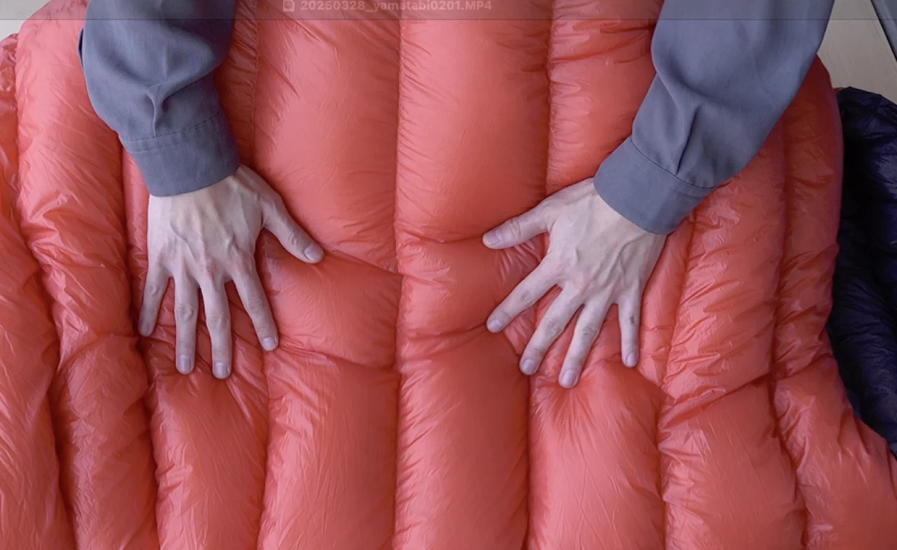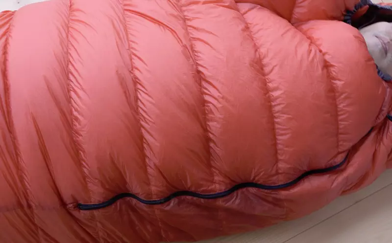 そして表生地には10デニールのナイロンタフタが使用され、織密度が高いためシュラフの抜けはほとんどなく、表生地が結露で濡れても中の段を濡らしづらいDWR加工で軽さと保温性を兼ね備えたシュラフに仕上げています。
