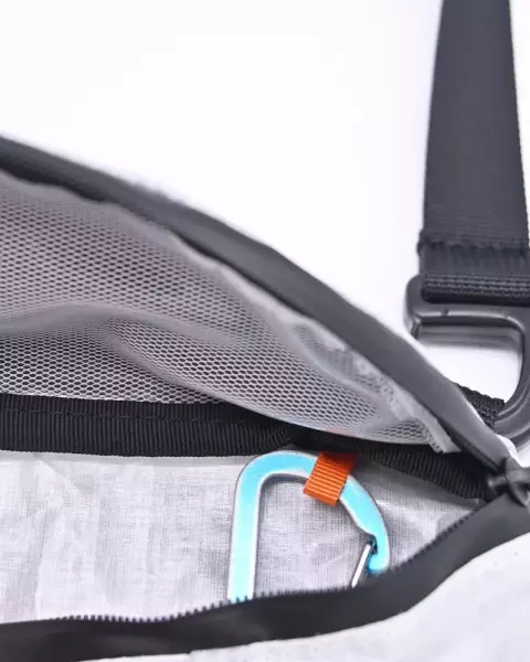 ショルダーベルトの一部に、テントのガイラインなどに使われるラインロックを使用しています。ラインロックのコードを引き下げたり引き上げたりするだけで、素早く簡単に肩ひもの長さが調節できるので、行動中、サコッシュが膝と干渉して邪魔になることがありません。