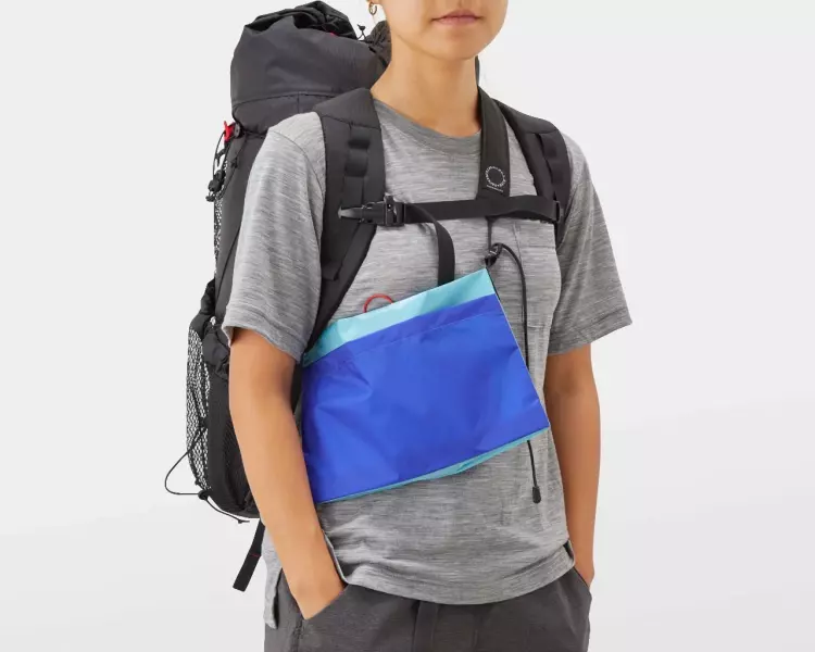 重量80gと軽量で、登山でもタウンでも使えます。サコッシュとして斜め掛けしたり、ウエストバッグとして腰に固定したりできます。開口部が大きく開くので中のものを取り出しやすく、外側にはドローコードが付いているのでウィンドブレーカーなどを固定しておくことができます。また、撥水加工が施されているので水をはじき、パッカブル仕様で持ち運びも便利です。