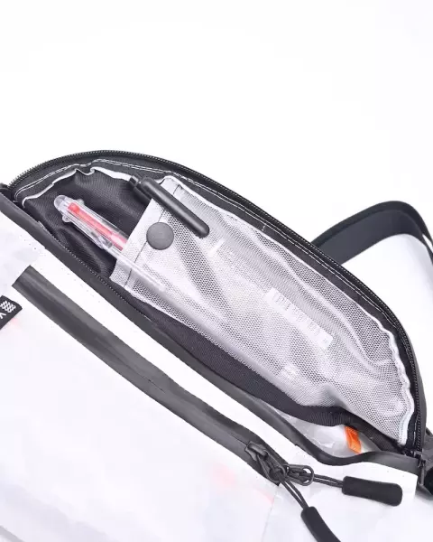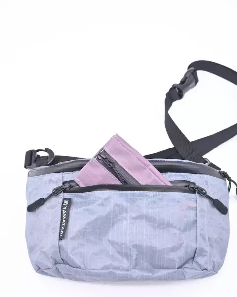 Xパックライトスキンを使用した、濡れに強く耐久性に優れ、軽量なサコッシュです。ボトム部分にスナップボタンが設けられ、ボトムの幅を変えることができます。また、テントに使用されるアジャスターを採用し、ストラップの長さを簡単に調節できます。