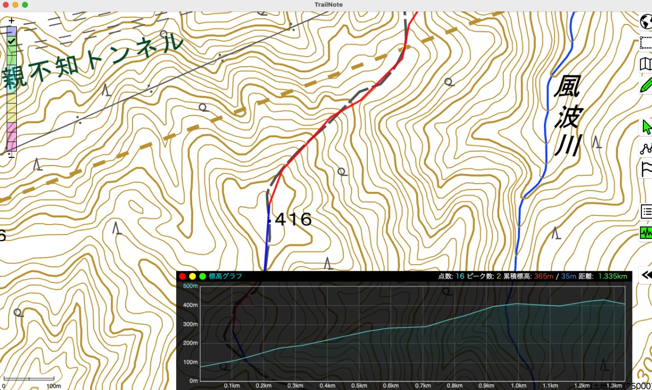 このような場合は今までジオグラフィカを使ってルートを確認していました。MacユーザーなのでTrailNoteという地形図の印刷とルートを編集することができるアプリをパソコンで使い、Gpxファイルをエクスポートして、ジオグラフィカやスマートウォッチで確認というのが今までの方法でした。