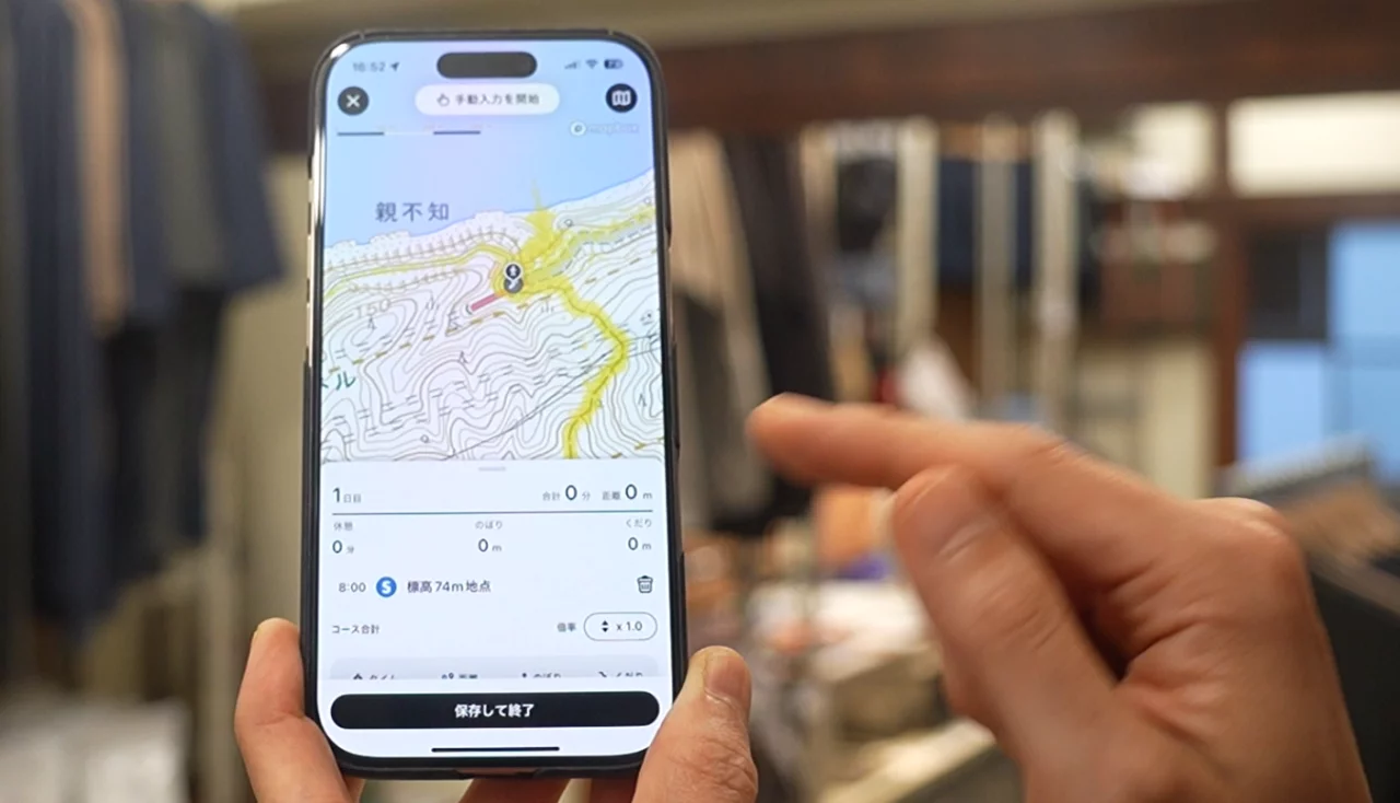 ポイントになるようなところまでなぞり書きしたら、次に画面下部にある「行程に追加」ボタンをタップして行程を保存します。こうすることで標高〇〇地点というポイントが保存されそこまでの所要時間がわかるようになります。