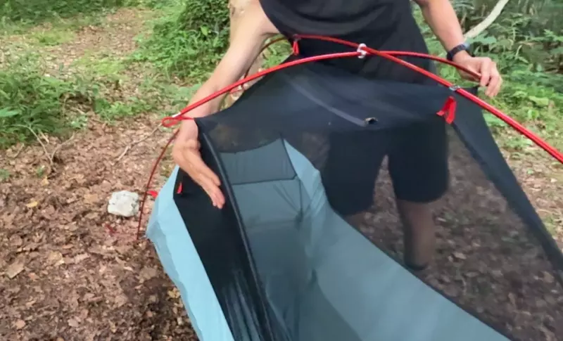 吊り下げ式は先にインナーテントにペグダウンをしてから、テントを立てることができるので、スリーブ式と比較するとテントを設営している時に風で飛ばされづらいメリットがあります。