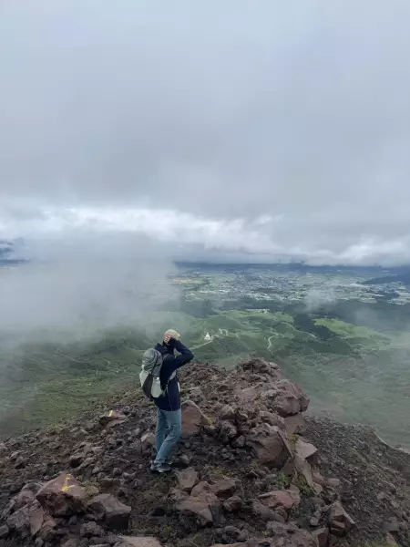 はじめのコースがめちゃくちゃ急登で一気に600くらい上がるのだけど、辛いと思いながらもガスが濃くて思考が閉じるので案外楽に登れた。後ろを振り返ると真っ白で、本来見えているはずの火山の雄大さは、見えても足元から数百メートル。雄大というか壁が白い。たまに切れたガスの隙間から街が見えるが、街から5分のところを登っているのでまあ近いである。