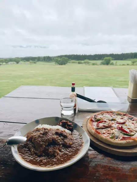 カフェぼいぼいはキャンプ場の隣にあるログハウス風のカフェで、ひっろーいキャンプ場を一望できる場所にテラス席があって、尚且つ空いていた。カウンター席のように山並みとキャンプ場を眺めながら、ピザとカレーを注文。カレーは絶対に半分でいいはずでジュンにどうするか聞かれたのに「カレーってどんなに食べても量おんなじじゃない?」という訳のわからない返事をして一人一皿注文。ここまで読んだらわかると思うが、当然量が多すぎて二人して「ウプ」となった。ピザは信じられないくらい熱かった。