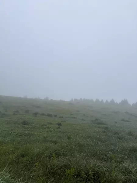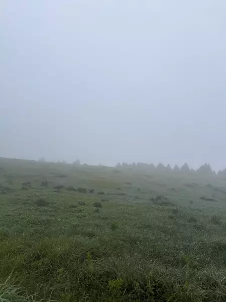 とはいえ登っている時はそんな具合にローテンションながらもご機嫌だったんだけど、高岳への分岐通過した後の稜線(なのか?何も見えなさすぎてよくわからない)は久々に悪天候すぎて面白くなってしまった。霧雨みたいなのも降り出したからレインを着てフードも被る。フードの余った布で風が遊んでバタバタバタと激しく顔を打ちつける。なんかもうおかしくて声出して笑っちゃった。何がおかしかったのかというとうまくいえないんだけど、多分色々まとめると「休みの日に九州来て早起きしてこんな思いしてる人生ってなんなんだろう」って言うおかしさなんじゃないかと思いました。