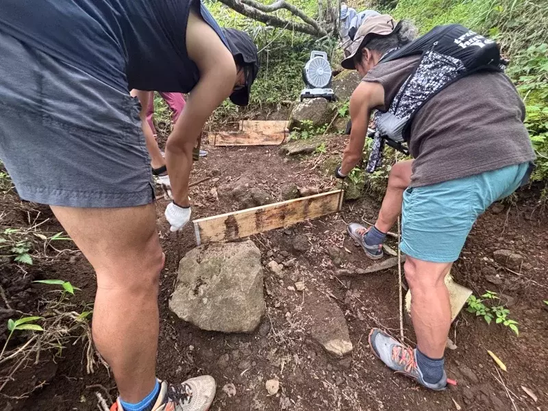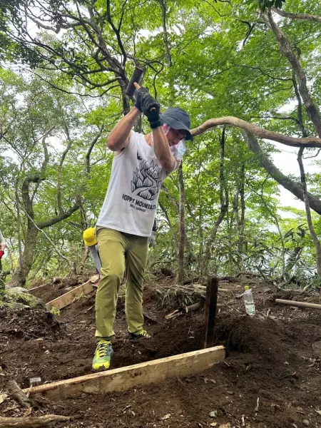 今回、整備を行ったのは金時山頂上から乙女峠側に向かって下ってすぐのテクニカルな坂道のエリア。この道をハイカーが歩きやすくなるように、階段を制作しようとなった。ほとんどの参加者が初のトレイル整備ということもあり、最初はSave Kintokiの皆様が作業している姿を見るだけしかできなかったが、徐々に習うより慣れろ精神で全員が積極的に手を動かすようになった。木材を運ぶ人、木の杭や鉄の杭をハンマーで埋め込む人、スコップで土を掘り土嚢を作る人、その土嚢を運搬する人などいつの間にか役割が分かれ、最終的には分業しながら作業を行ったことで、非常にスムーズに整備を行えていたと感じた。