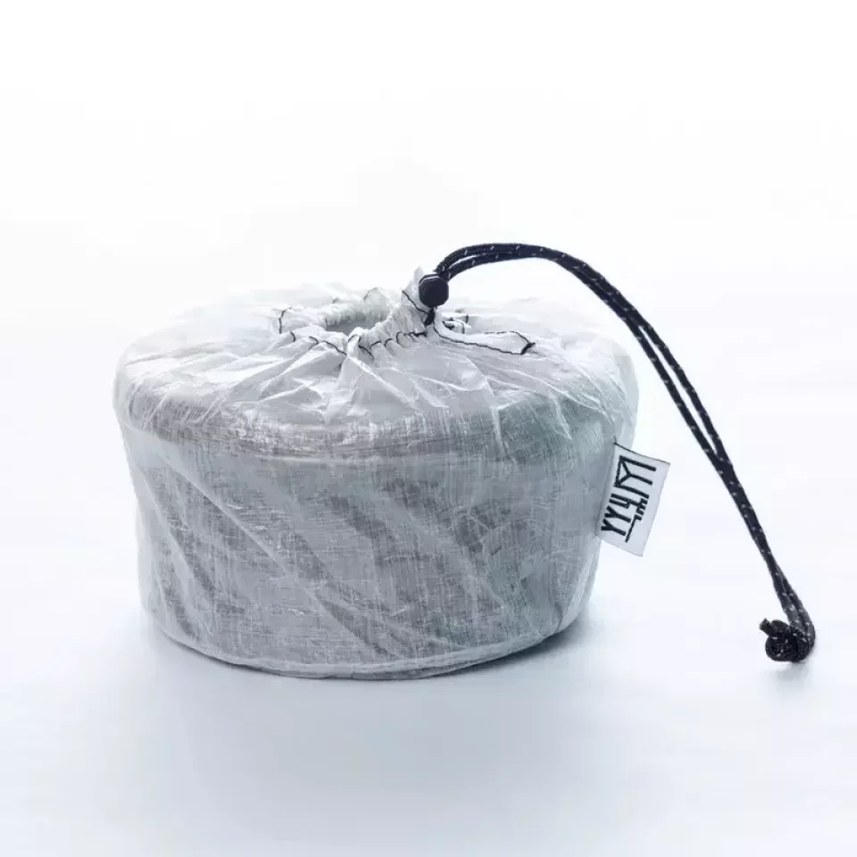 エバニューのTi 570FD Cupなどのクッカーを収納するのに最適なクッカー用スタッフバッグです。中身の出し入れがしやすいよう開口部は底に比べて広めにできており、ダイニーマで作成しているため耐久性に優れ、非常に軽量です。