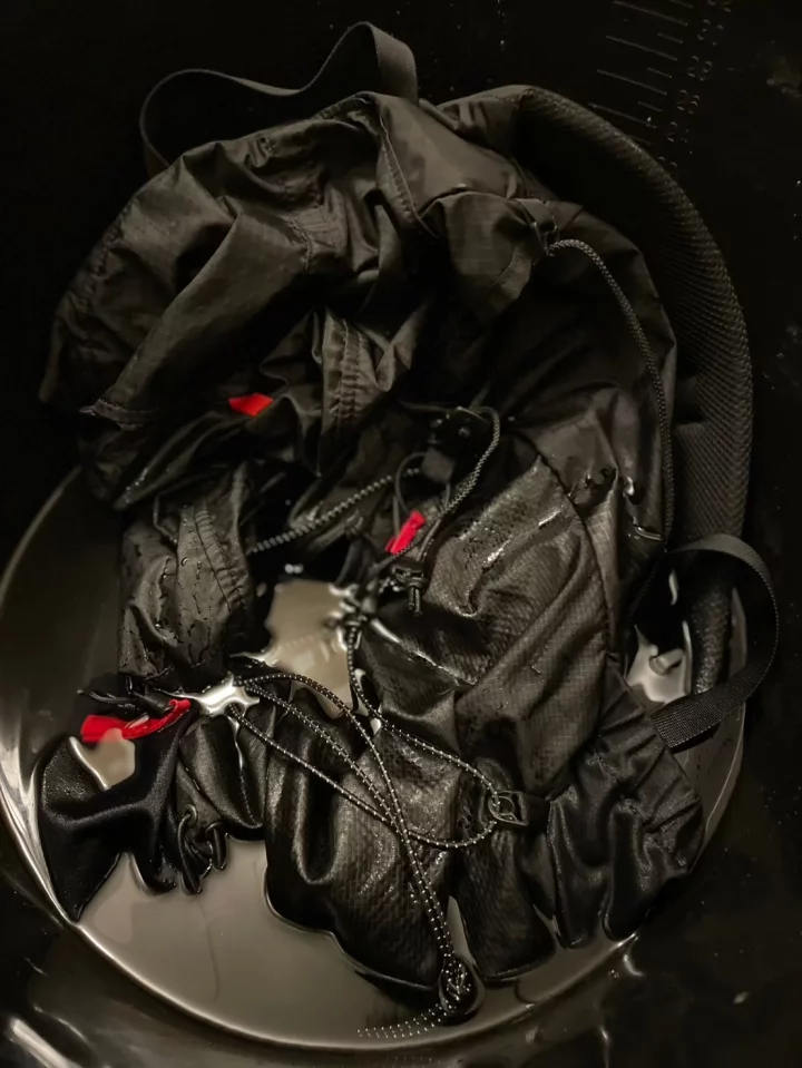 ①予洗い ぬるま湯にザックを浸け、大まかな汚れを浮かせます。この時点で頑固な汚れは軽くブラッシングして落とします。