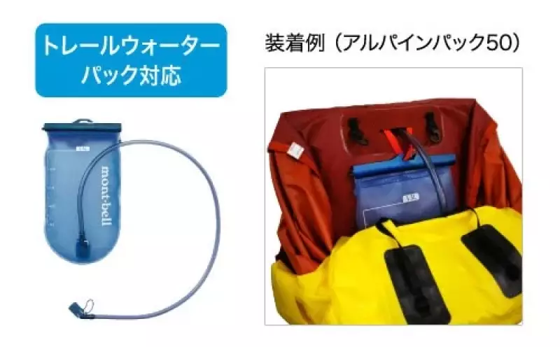 ハイドレーションシステム(トレールウォーターパック)に対応しており、防水袋の外側に装着できる設計となっている。チューブは本体背面上部の穴から取り出せ、ショルダーハーネスに固定できる。