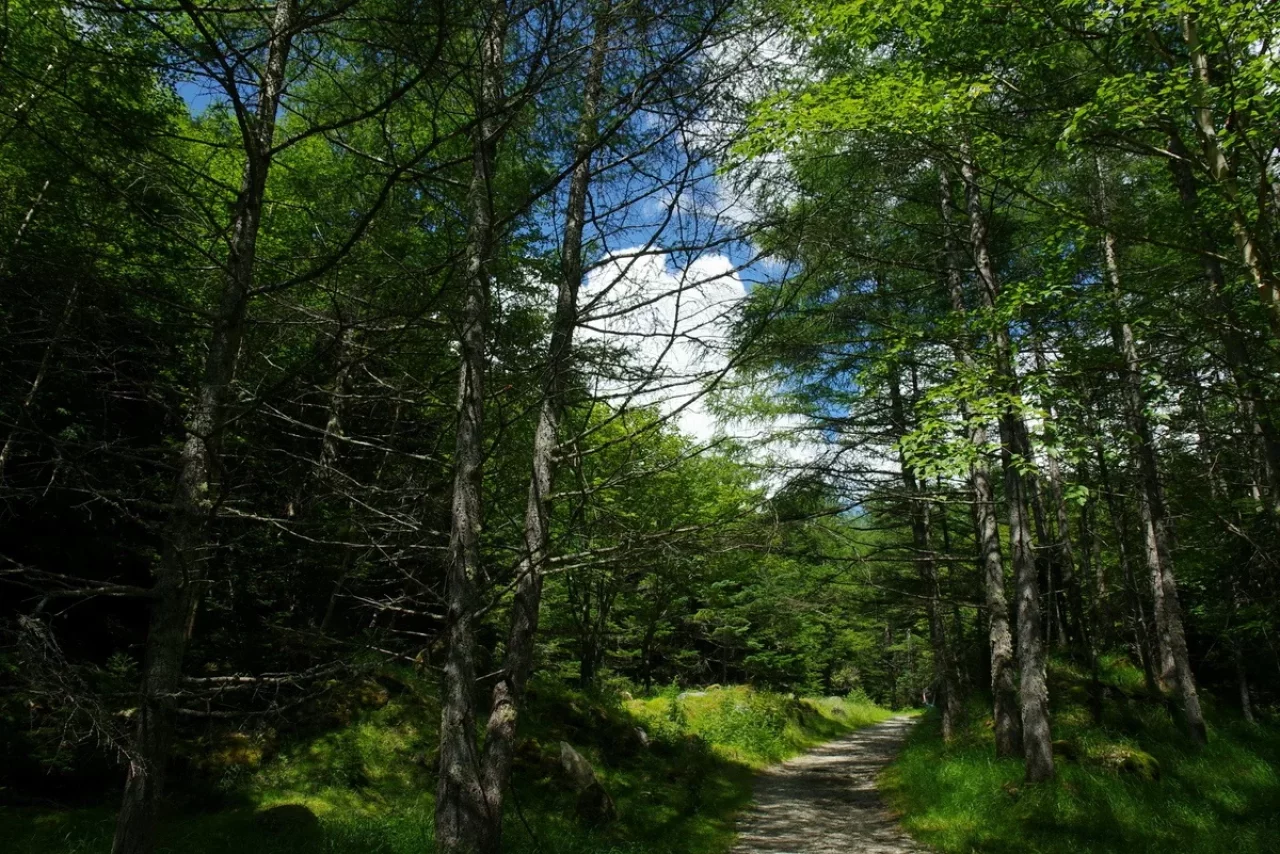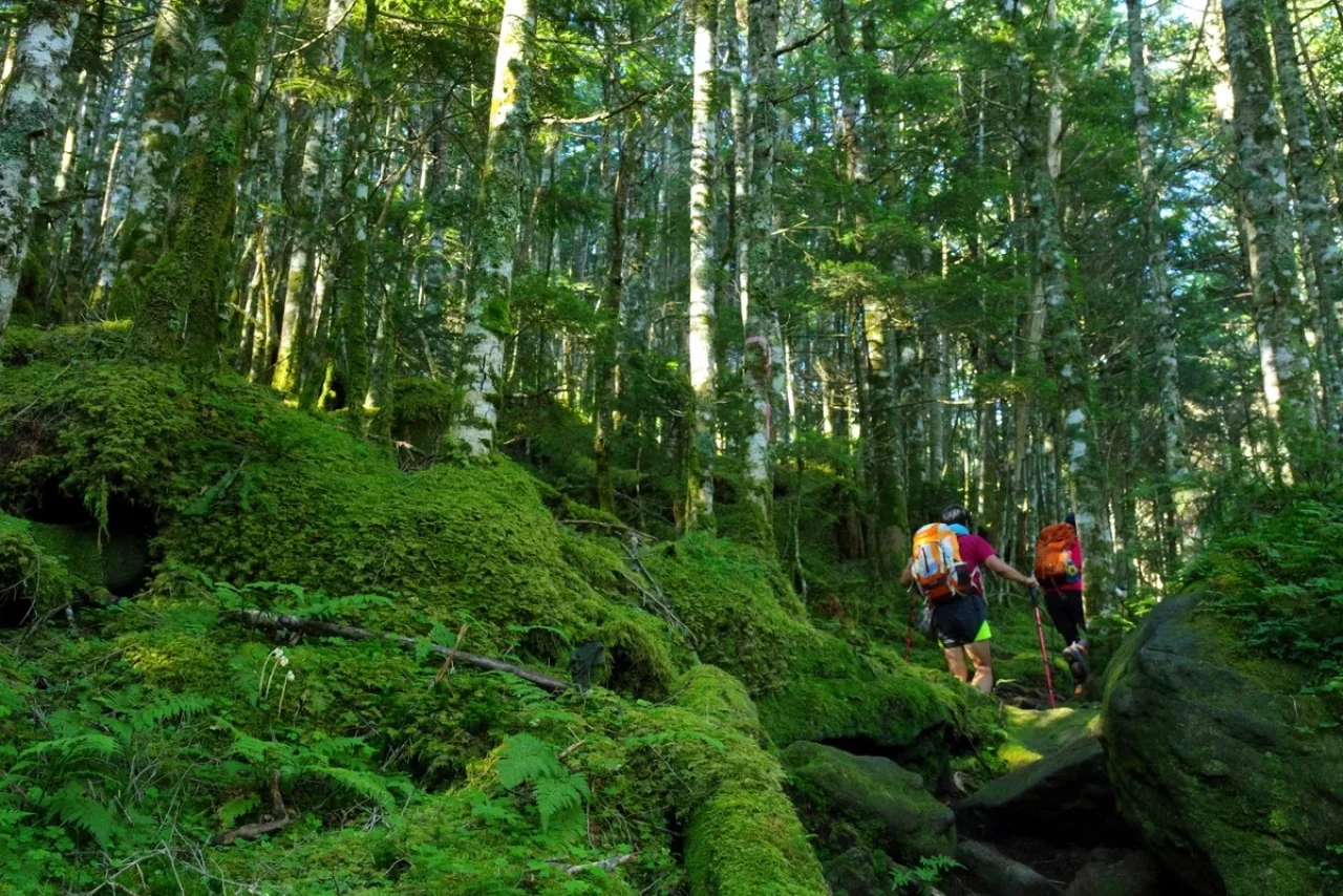 登山道に入ると、すぐに苔むした森が広がる。シラビソやコメツガの針葉樹林が天を覆い、足元にはびっしりと苔。木漏れ日が差し込み、幻想的な雰囲気に包まれる。