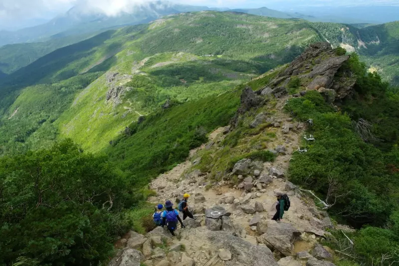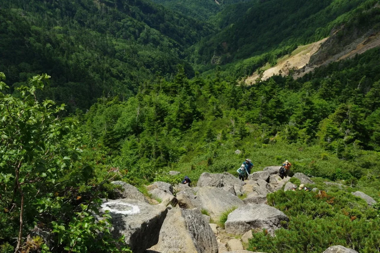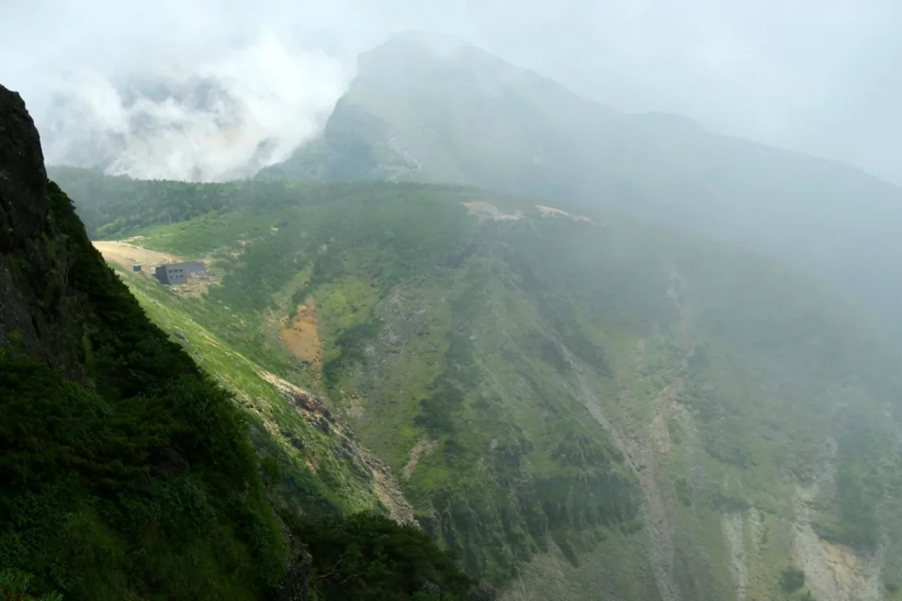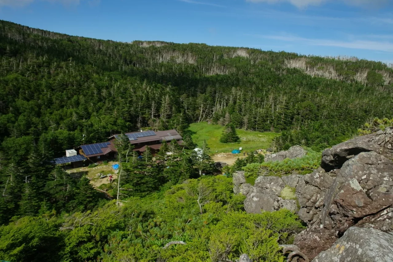 ふと顔を上げると、空の青さが目に染みる。遠くの山々が静かに連なり、眼下には黒百合の森が広がっていた。黒百合ヒュッテが森の中にぽつんと見えた瞬間、ほんの少しだけ足が軽くなった気がする。