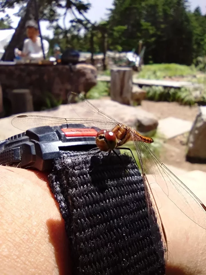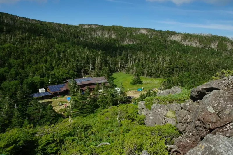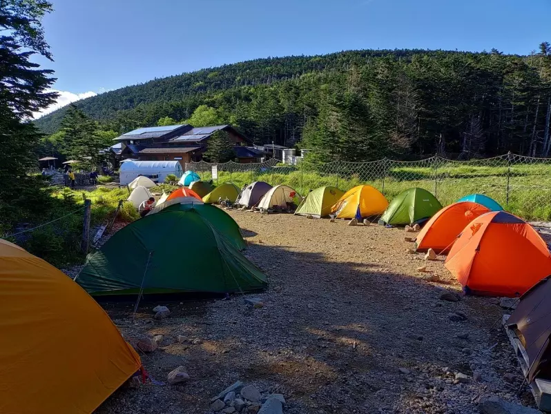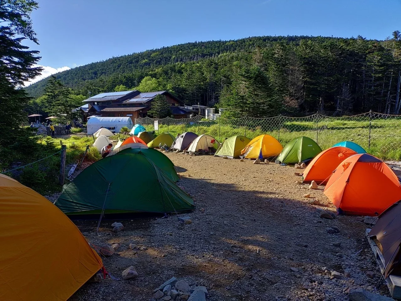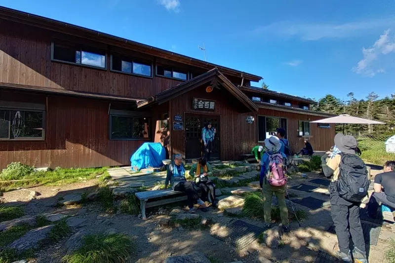ふらふらしながら黒百合ヒュッテに到着したのは午後3時過ぎ。コースタイムのほぼ倍という体たらく。標高2,400mに位置するこの山小屋は、北八ヶ岳の登山道が交差する要所。木造のあたたかみある建物、談話室の薪ストーブ、窓の外に揺れる針葉樹——ここは登山者の疲れを包み込むような空気に満ちている。テント泊は1人1,500円、水は天水を利用できる。トイレは臭わずとても清潔。幕営後しばらく安静にしていると体調も徐々に回復した、、、、かも。