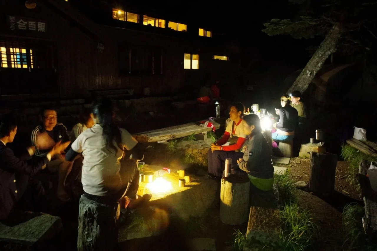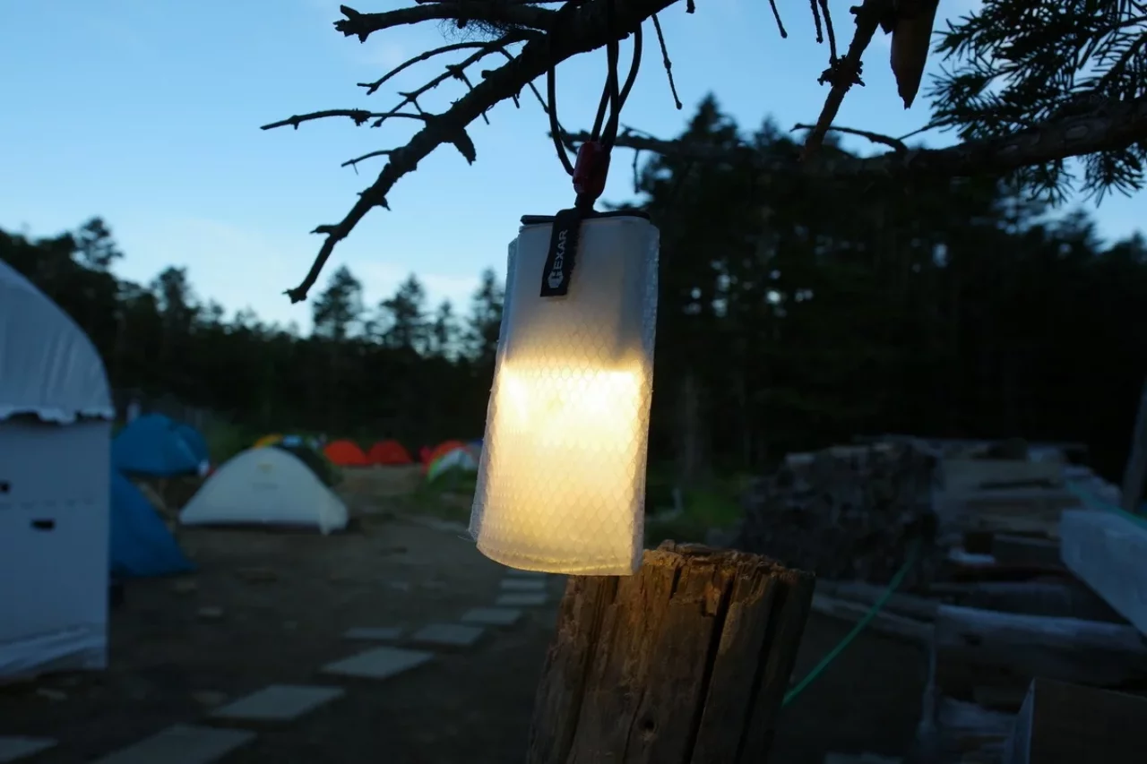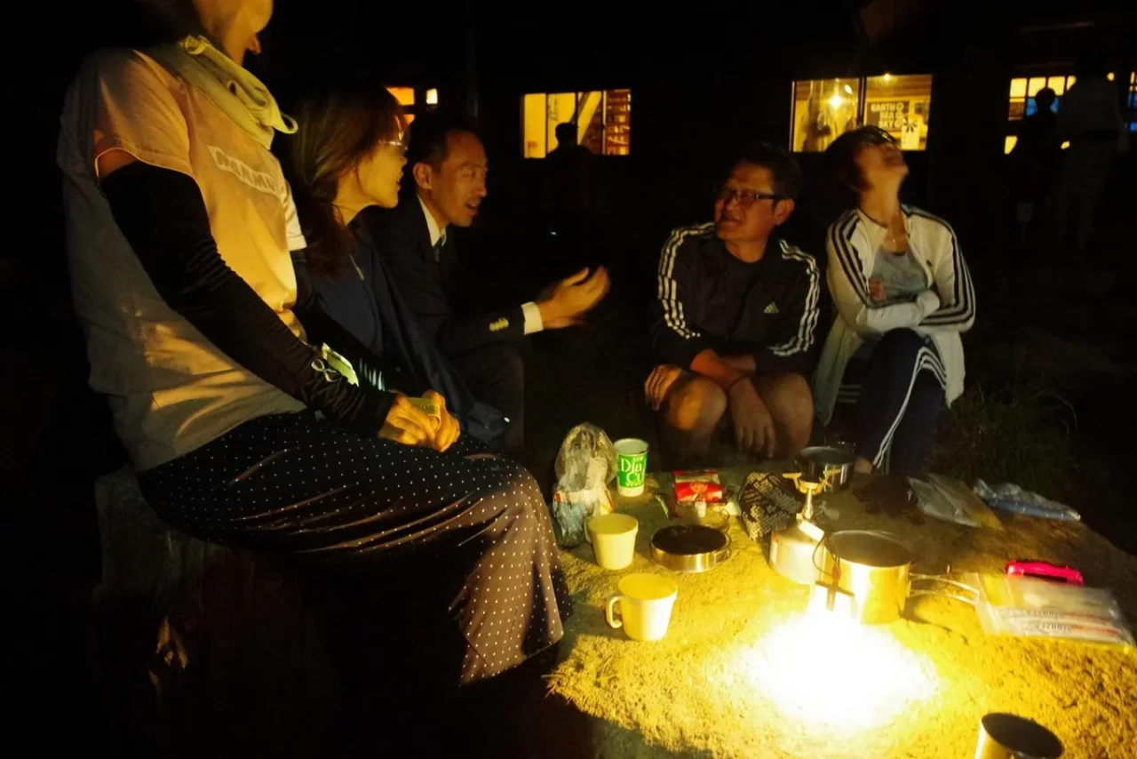 持参していた「HEXAR 」を6灯、各グループに分けて灯してみた。小屋前は小屋の中より明るくなり、場の空気が華やいだ。人は灯りのある場所に自然と集まる。山でもそれは変わらない。