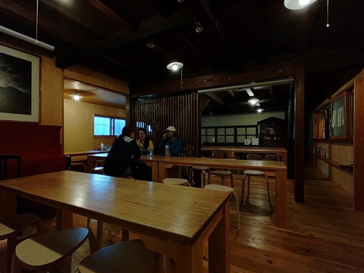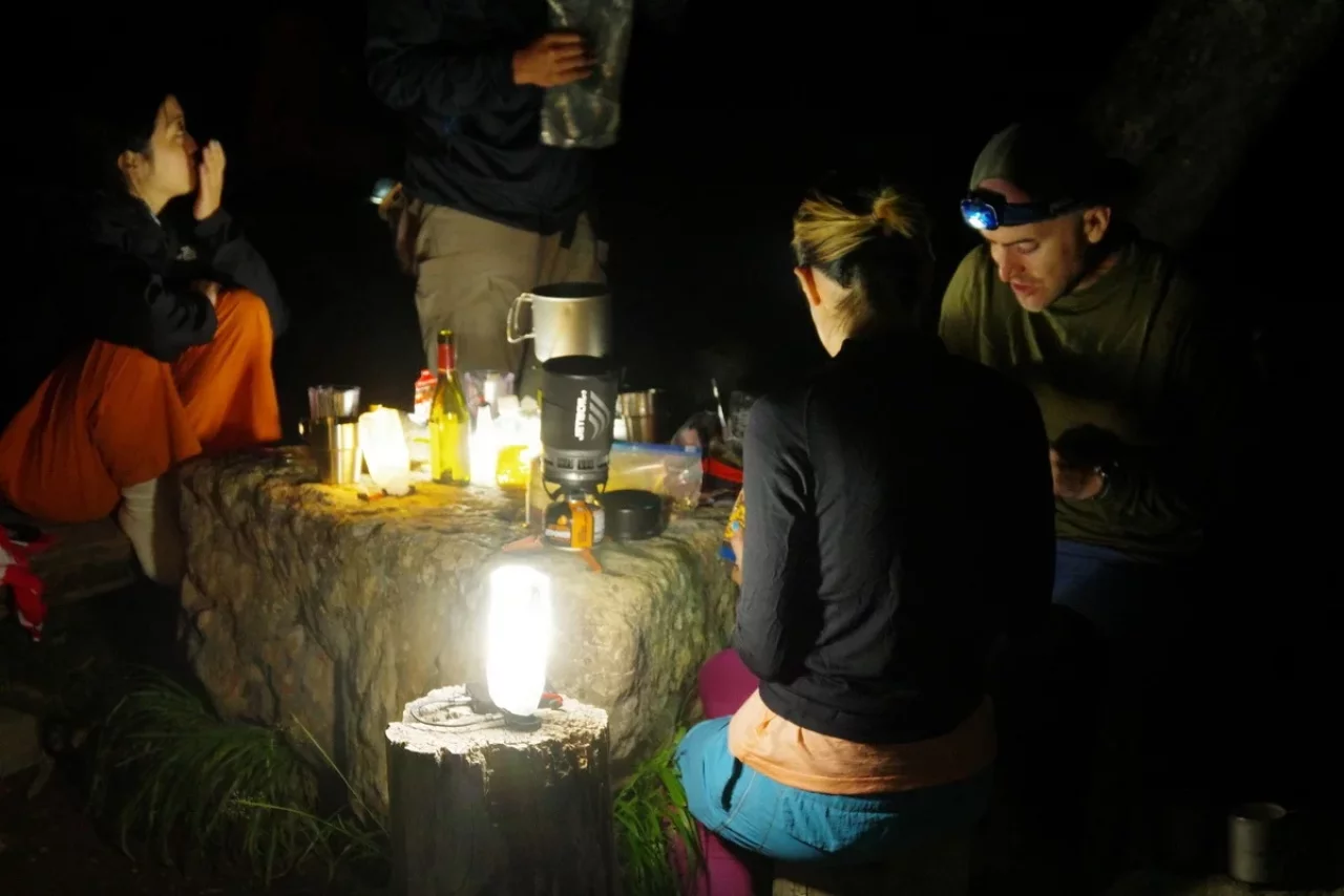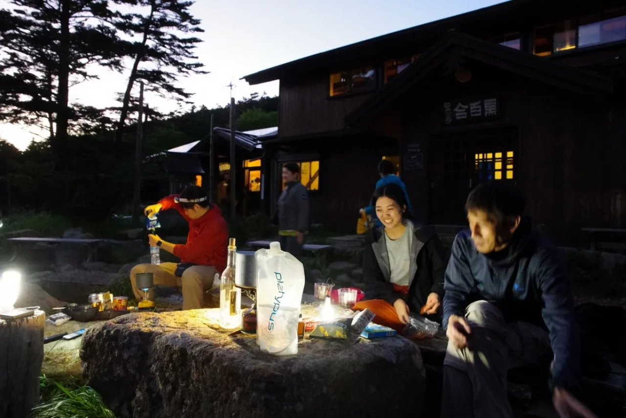持参していた「HEXAR 」を6灯、各グループに分けて灯してみた。小屋前は小屋の中より明るくなり、場の空気が華やいだ。人は灯りのある場所に自然と集まる。山でもそれは変わらない。