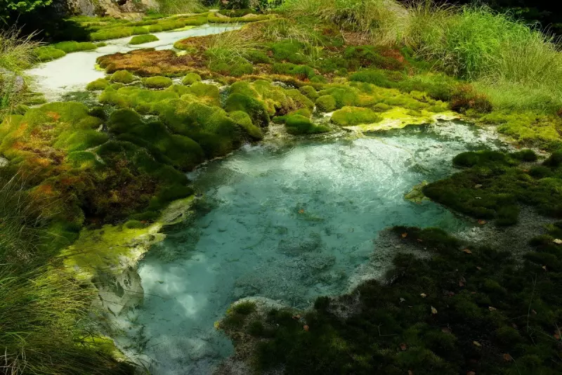苔の森を抜けて唐沢鉱泉手前、庭園のようなコバルトブルーの水を湛えた神秘的な池が。後にそれが唐沢鉱泉の「源泉」と知る。地中から湧き出る鉱泉が池を満たし、底の白い「湯の花」と緑のコケと調和した景観に静けさと美しさを感じます。