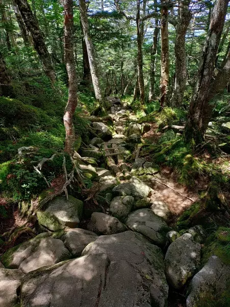 支度を整え下山を開始する。道はアップダウンが少ないものの、ガレ場や苔むした岩場が続き、何しろ滑るので油断は禁物。慎重に足を運びながら、苔の森の美しさに心を癒される。