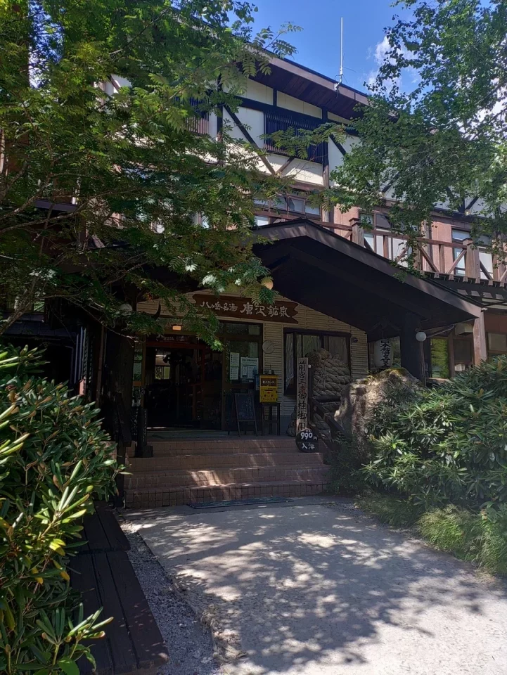 天狗岳登山道起点、唐沢鉱泉は10 ℃の源泉を加温した鉄分豊富な鉱泉。日帰り入浴は午前10時~午後3時30分(受付午後3時まで)。湯船は石造りで、ほんのり赤みを帯びた湯が肌を包み込む。窓の外には針葉樹の森が静かに揺れ、湯気の向こうに差し込む光が、まるで森の呼吸のよう。