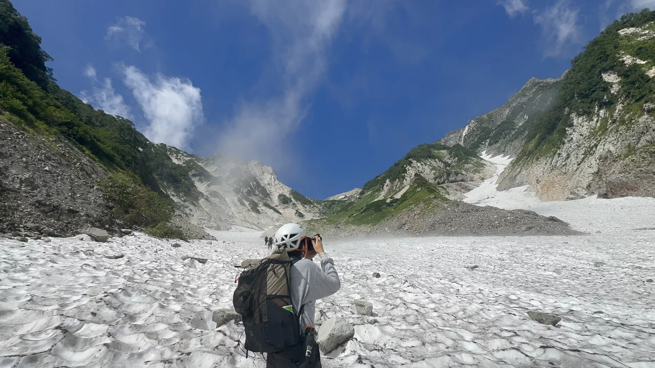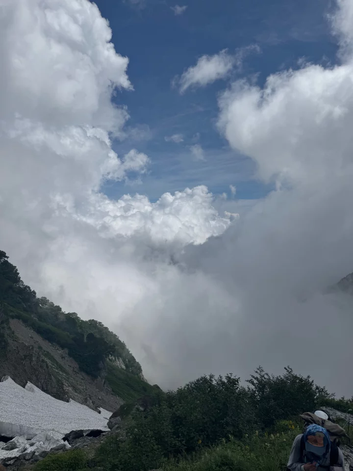 ガスが上がっていくと、下で見た青空が再びはっきりと雪渓を照らす。ミストの幕があがり、左右の山壁が勇ましく際立つ。私たちが歩いてたところってこんなにかっこいい場所だったんだぁ。