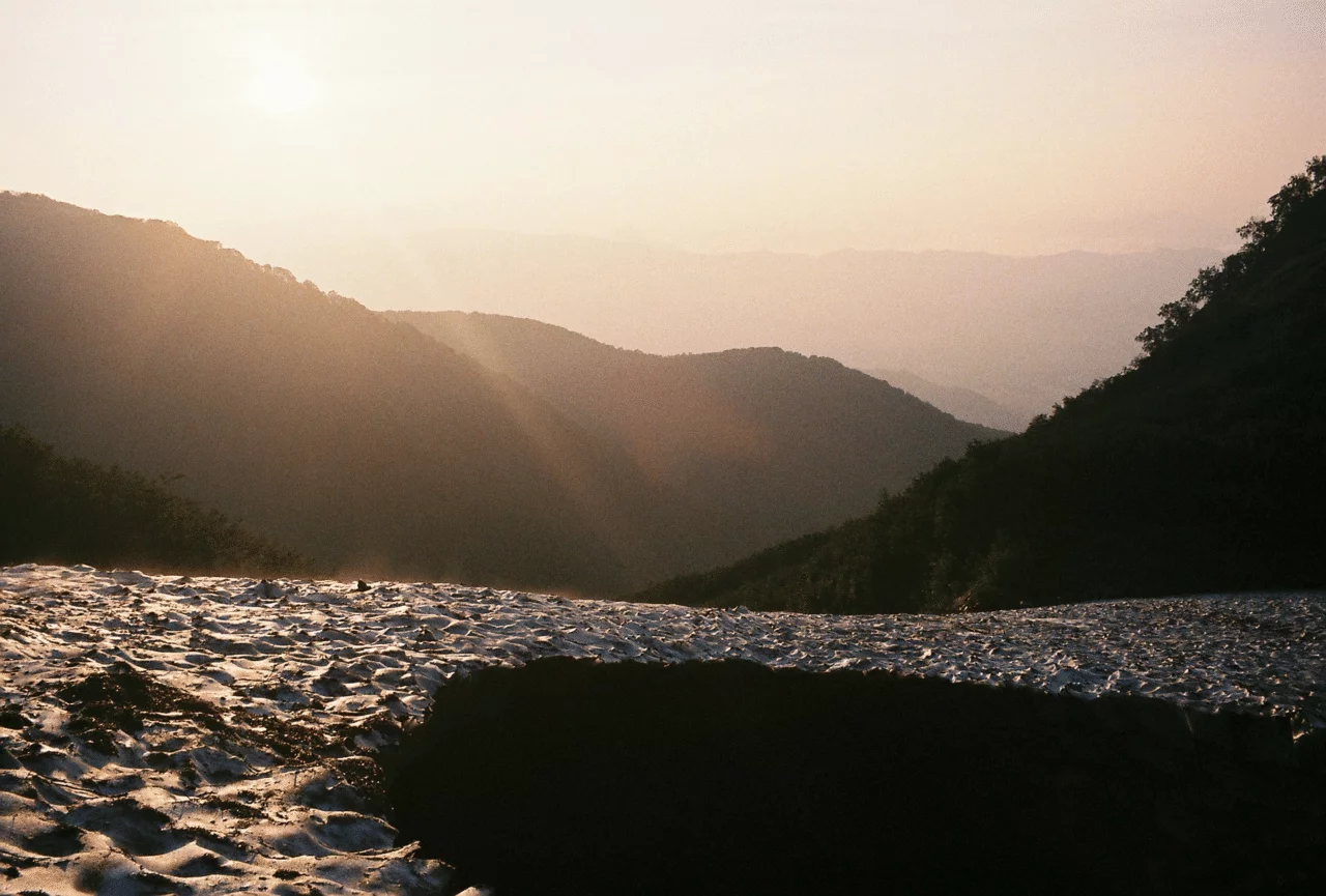 歩き出した6時半の空気は透明で、何の不純物のない空気に、何百メートル先までも音が真っ直ぐ届きそうだ。捌けきらないガスが、山の姿を隠さないほどの薄さを保ちながら稜線にまとわりつく。ガスのレイヤーを一枚纏うことで、まるで空に山が透けているかのような錯覚に陥る。