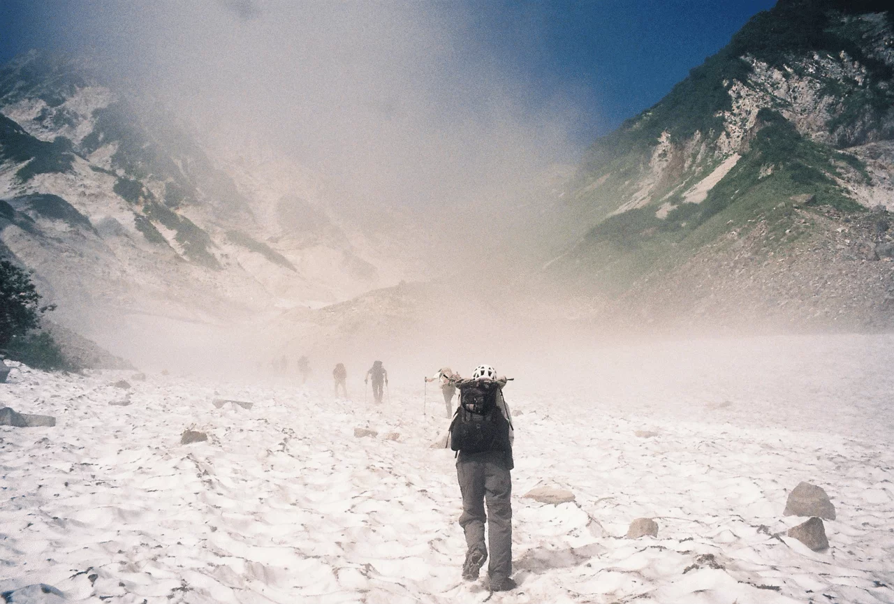 今はYAMAPがあるし、これまでの登山の知見も多少あるので、この雪渓に終わりがあることはちゃんと知っていた。それなのに、ちょうどこの時出ていたガスのせいで、数m先がホワイトアウトして見えない。せっかく大人になったのに、これじゃこの雪渓が永遠に続くと思えた子供時代と変わらないじゃないか。
