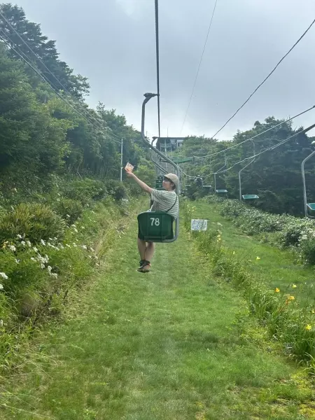 剣山はリフトで登れると聞いて興奮していたが、リフト乗り場に到着するとそのリフトは1人乗りで、なおも興奮した。おもちゃみたいなリフトに運ばれて1人ずつで山頂付近まで。