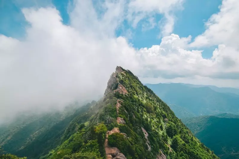 石鎚山の山頂に着くとガスっており、ありちゃんの絵で見た天狗岳は綺麗には見えなかった。それでも1時間ほど時間を潰していると時折ガスが切れて青空と緑の天狗岳を見ることができた。これこれ、これが石鎚山の景色。