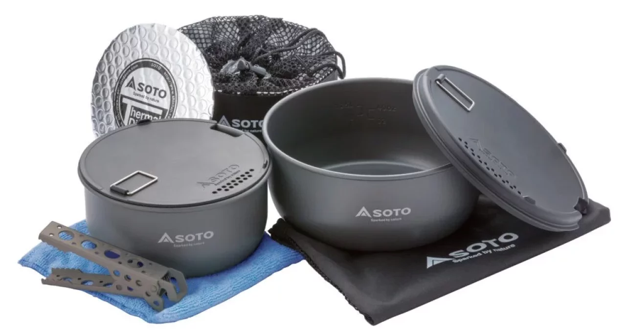 SOTOが山岳用クッカーに本格参入した意欲作。広口の浅型クッカーで、1.3Lの小鍋でも袋ラーメンを折らずに調理できるサイズです。ハードアナダイズド加工により、一般的なアルマイト加工よりも厚い被膜が施され、耐衝撃性・耐摩耗性・耐蝕性に優れています。
