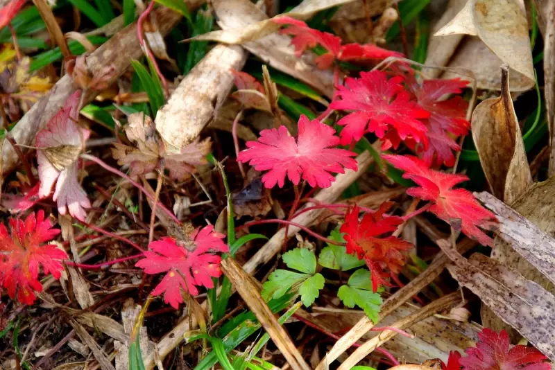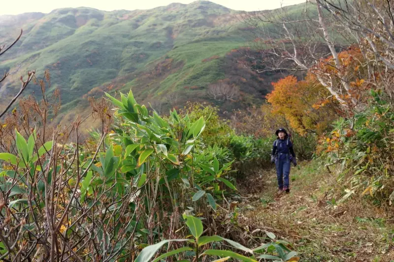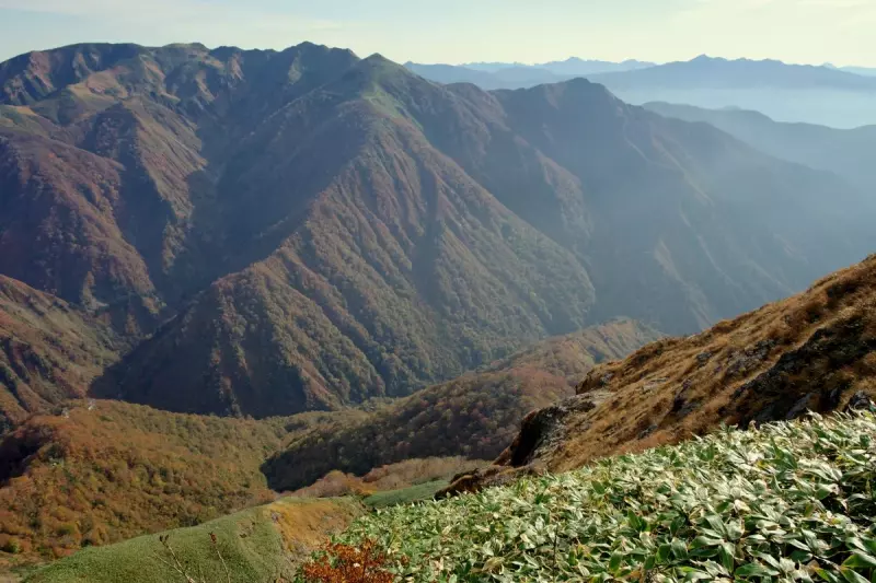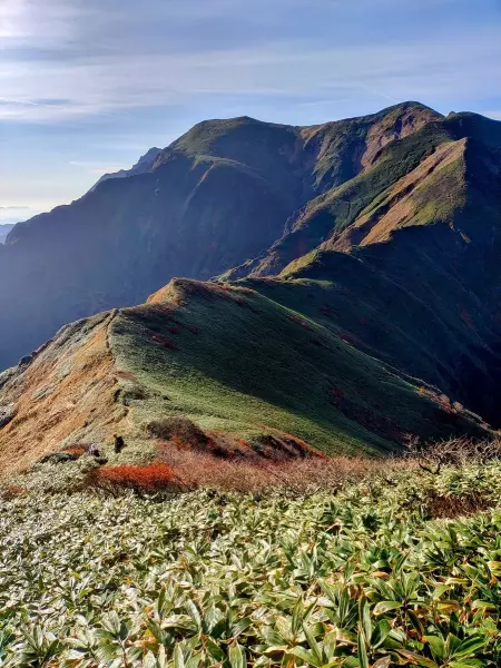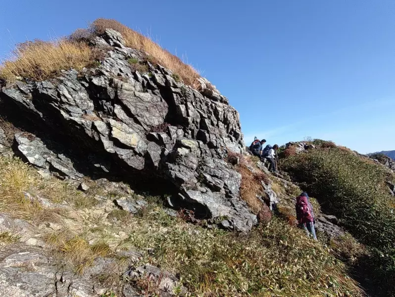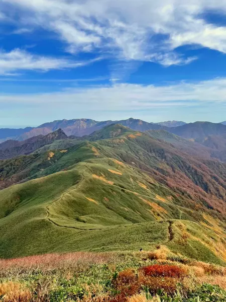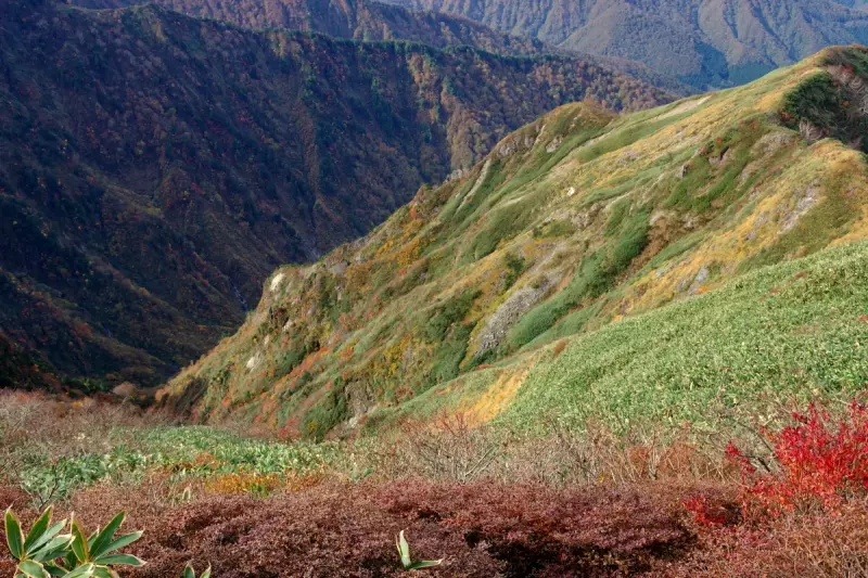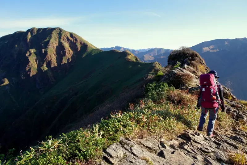 茂倉岳の頂から武能岳へと続く稜線は、谷川連峰の中でも静かで重厚な空気に包まれた縦走路。岩稜と草原が交錯する道は、展望に恵まれながらも人影は少なく、秋には紅葉が稜線を彩ります。武能岳に近づくにつれ、岩肌に張り付くような赤が際立ち、低山とは思えない迫力。