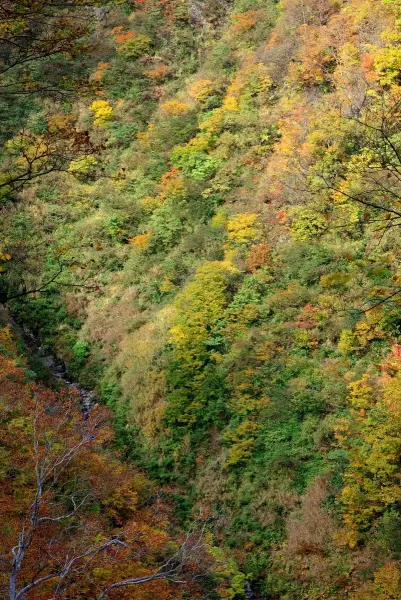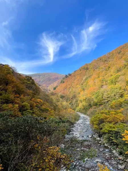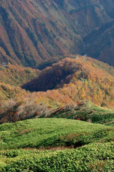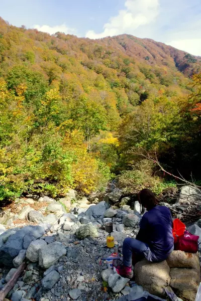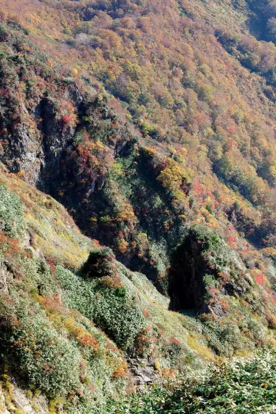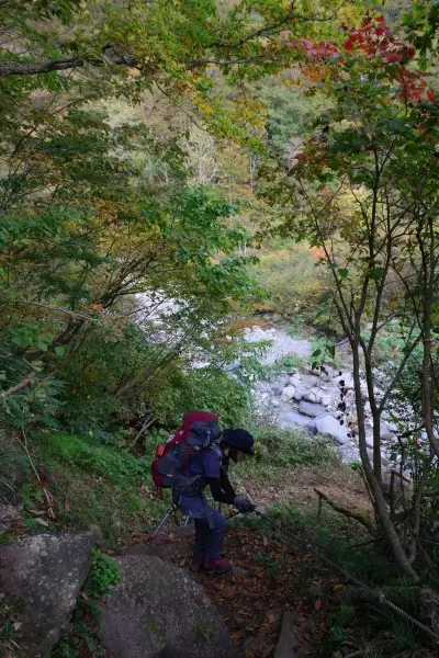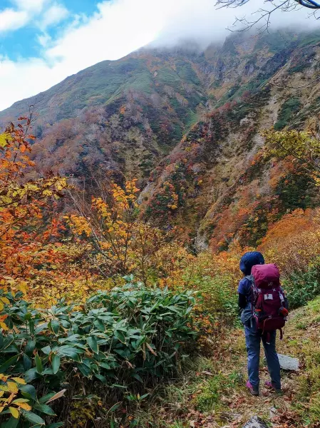 武能岳から土合駅へと至る登山道は、白樺沢と武能沢の間を縫うように進む、谷川連峰の静かな裏ルート。武能岳の重厚な山容を越えると、沢沿いの道へと下り始める。武能沢では岩壁に沿って紅葉が張り付き、秋の彩りが静寂の中に映える。白樺沢では苔むした岩と滝の音が心を癒し(滑りやすくて怖い(^^;です)、沢の流れに寄り添うように進む道は、変化に富んだ地形と自然の美しさを存分に。やがて谷川岳ロープウェイの見張小屋を過ぎ、土合駅へとたどり着くこのルートは、喧騒無く谷川連峰の奥深さを知ります。