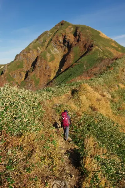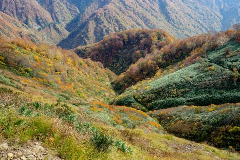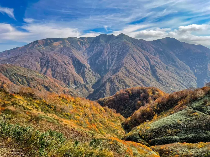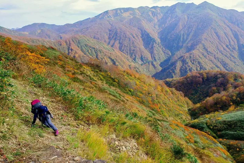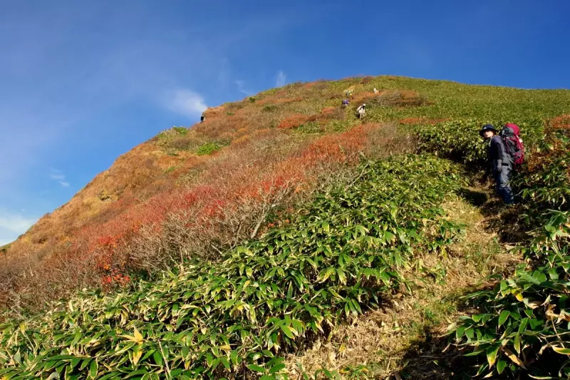 山頂まで長くはないけどがっつり登り。武能岳(ぶのうだけ)は、谷川連峰の一角にそびえる標高1760mの山。2000m未満とは思えない重厚な山容と、秋に岩肌へ張り付くように染まる紅葉が印象的。燃えるような赤が岩壁を彩ります。雪崩地形が生んだ急峻な斜面と、静けさに包まれた稜線歩きは、低山とは思えないスケール感。山に静かで力強い美しさを求めるなら武能岳は隠れた名峰です。