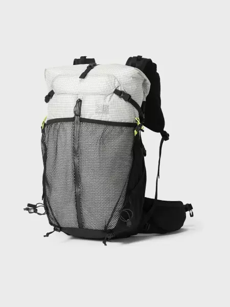 DCH素材の防水軽量構造にストレッチメッシュ外部収納を備え、長距離ULハイク特化型。