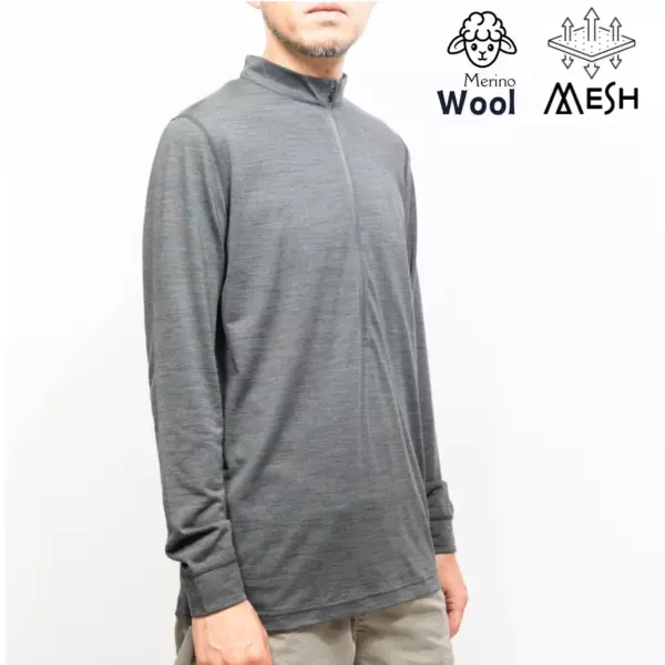 【山旅】バックメッシュ・速乾メリノウール・ジップアップ・ロングスリーブシャツ
