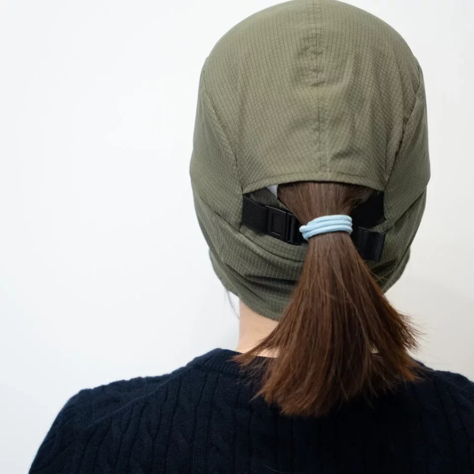 ストラップでフィット感を調節でき、髪の長い方はストラップ上部から結んだ髪を出すことができます。