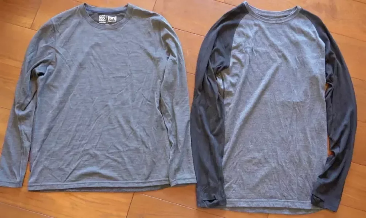 べースレイヤーには、吸汗速乾性と耐久性に優れた化繊素材(ポリエステル)、保温性と防臭効果を備えたメリノウール素材、双方のメリットを生かした混紡のハイブリッド素材があります。
