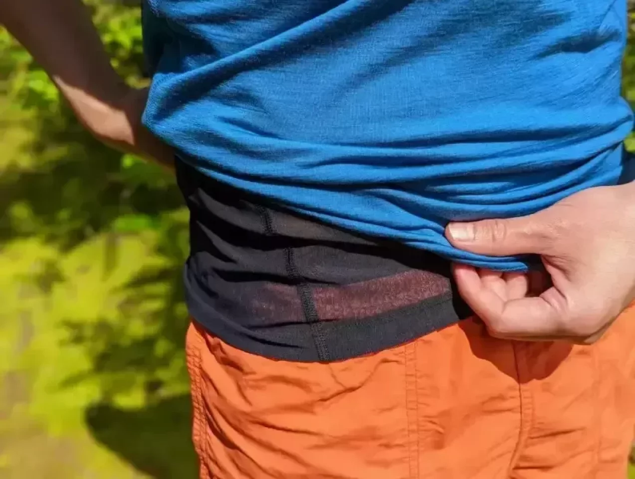 発汗量の多い背中全体と脇部分には、メリノウール50%・ポリエステル47%にポリウレタンを3%加えたメッシュ構造を採用し、優れた通気性と速乾性を実現しています。しかも、透け感が極めて少なく、男女問わず安心して着用できます。