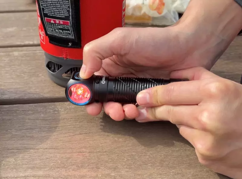 ボタンを押し続けると明るさが3段階で切り替わっていきます。明かりがついた状態でボタンを2回押すと最大と最小を切り替えることができます。明かりが消えた状態で、ボタンを2回押すと赤色ライトが点灯します。