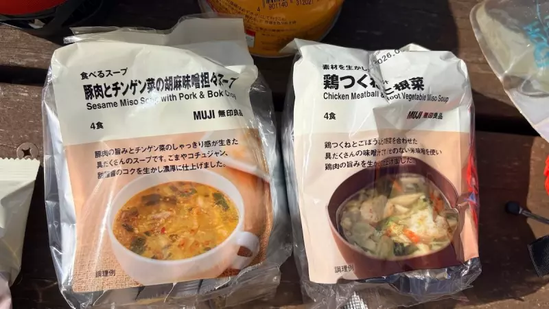 最後にご紹介するのは「鶏つくねと根菜のフリーズドライスープ」です。登山の食事や休憩中に、温かい汁物を手軽に楽しみたいときにぴったりなスープです。お湯を注ぐだけで、鶏の旨みと根菜のやさしい甘みが広がり、体の芯から温まります。軽量で携帯性が高く、パッケージもコンパクト。テント泊登山や雪山でのサブ食としてもおすすめです。特に寒い季節の稜線では、温かいスープが何よりのごちそう。行動中に冷えた体を一気にリカバリーしてくれます。塩分とタンパク質を同時に補給できるので、疲労回復にも効果的。