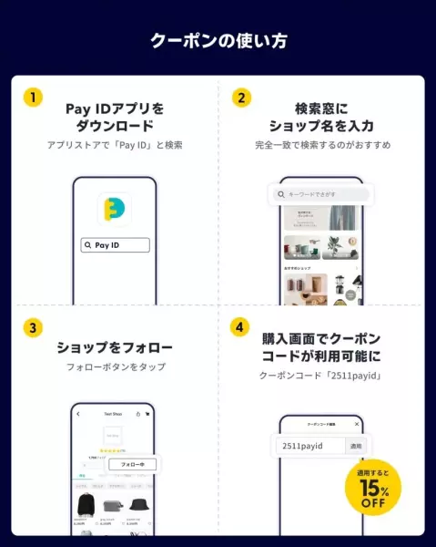 「Pay IDアプリ」にてフォローしているショップでのご購入のみ、クーポンの利用が可能。
